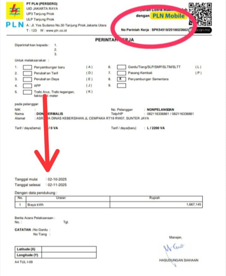 1. ada indikasi pencurian listrik sebelum tanggal (2 Oktober 2025). Diketahui SPMK 25 Oktober 2025.Mestinya sebelum pekerjaan dimulai (25 Oktober 2025), sudah terlebih dahulu mengantongi izin dari PLN.